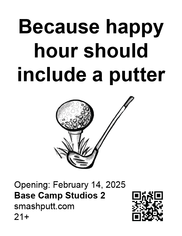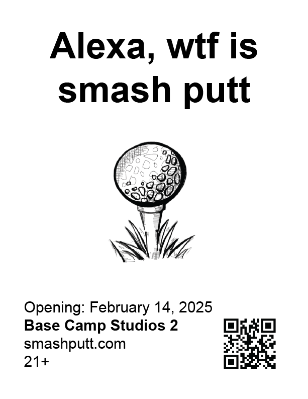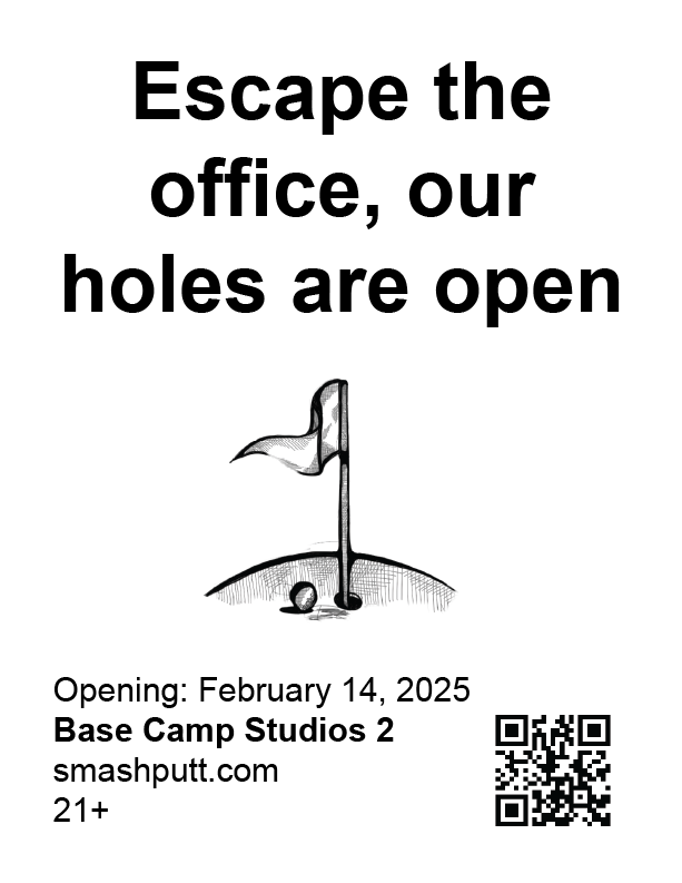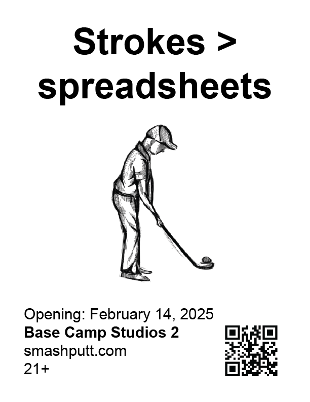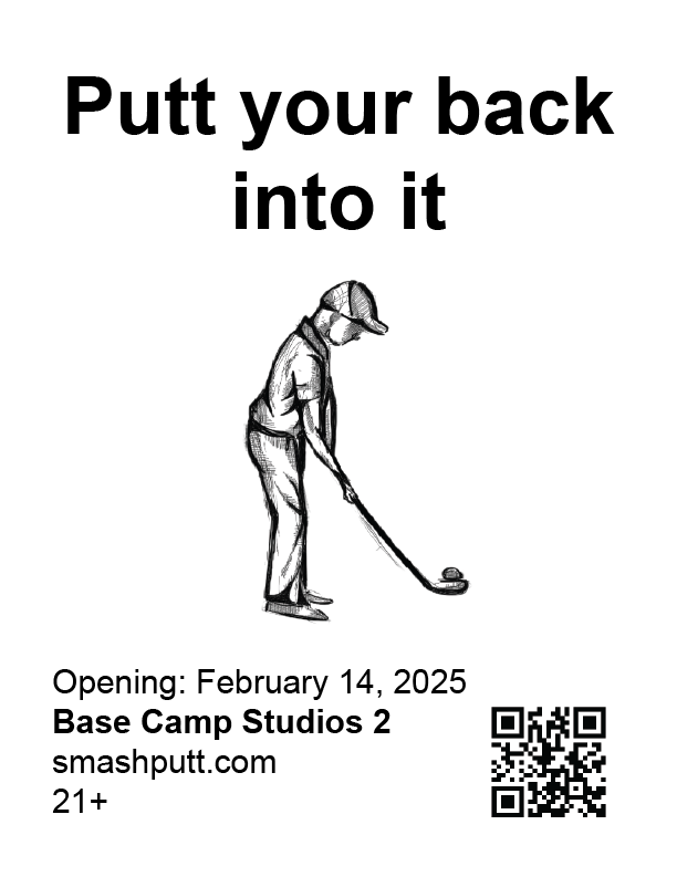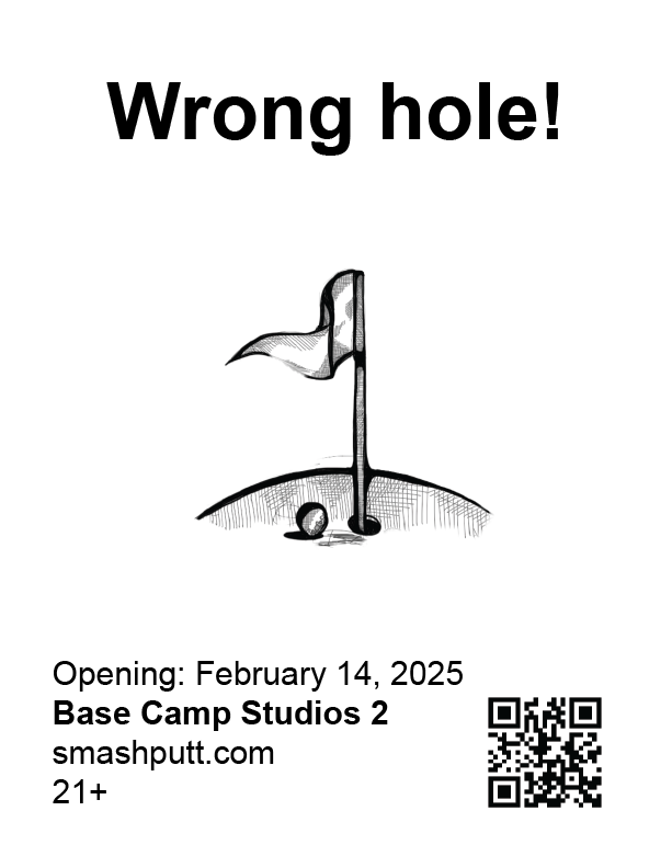 In collaboration with Base Camp Studio 2. Smash Putt's revival showcases 9 artist-made mini golf holes in March 2025 in Belltown, Seattle. Their branding plays off sexual inuendos and ironic absurdity.